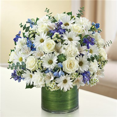 Blue is for sorrow, and white for the hope that inevitably overcomes it – this is a sentiment they will cherish. Our sympathy arrangement of white roses, alstroemeria, blue delphinium and carnations, elegantly designed by hand in a graceful cylinder vase, is a touching tribute to a life well lived and the hope that will always prevail.