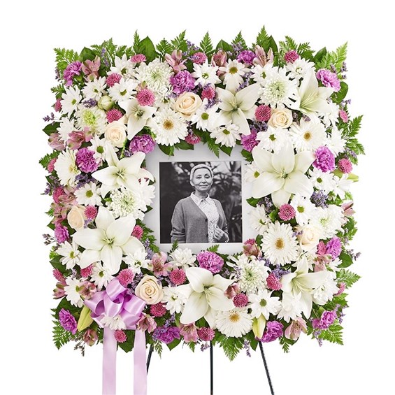 Offer solace with a sentimental arrangement for the services. Our square wreath features soothing-hued blooms and greenery for a lush, full presentation. A photo can be displayed in the center, creating a unique and beautiful tribute to a cherished loved one. Standing spray arrangement features a stylized 18" square wreath with white roses, Asiatic lilies, Gerbera daisies, mums and daisy poms, lavender Peruvian lilies (alstroemeria), button poms and carnations, purple Limonium; accented with assorted greenery and lavender satin ribbon Measures approximately 31"H x 31"W without stand Arrives on an easel; measures 66"H Appropriate for the funeral home or gravesite Our florists hand-design each arrangement, so colors and varieties may vary due to local availability To ensure lasting beauty, Asiatic and Peruvian lilies may arrive in bud form and will fully bloom over the next few days